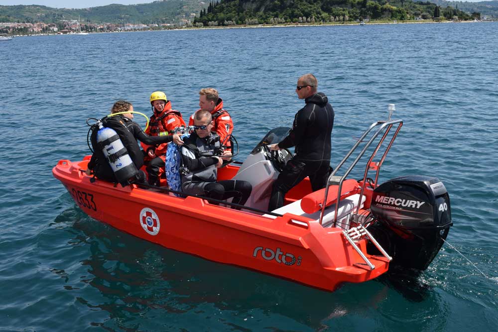 La version ROTO 450s RESCUE comprend une banquette arrière verrouillable pour le réservoir de carburant et le stockage, une autre banquette avant avec coffre de rangement, une console avec pare-brise et volant, des mains courantes en acier inoxydable et deux plaques en aluminium dans le tableau arrière pour le montage du moteur.
